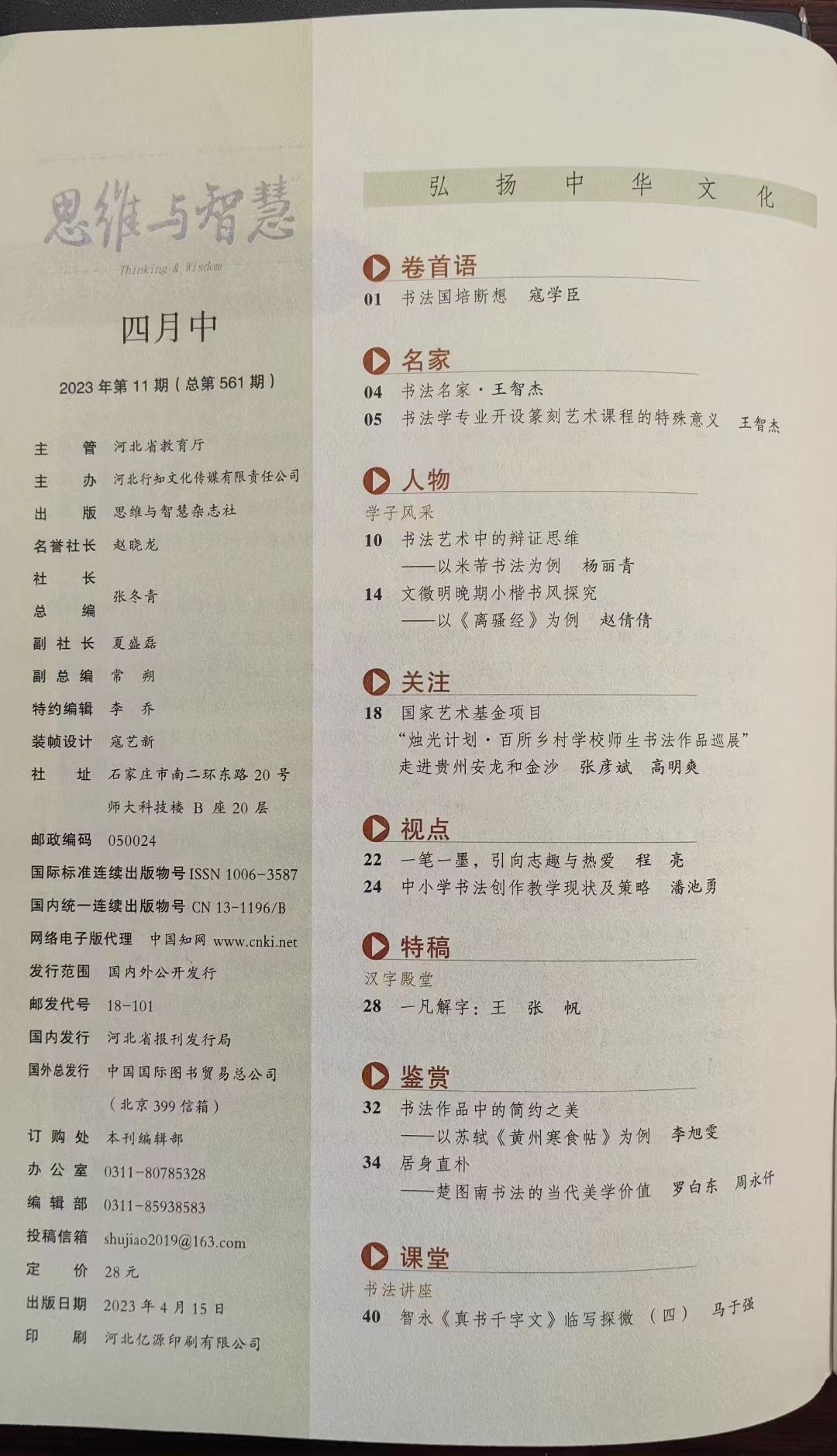 《思维与智慧》杂志2023年第11期名家栏目专版介绍了公司365上市集团官网经理王智杰教授,并刊载了王智杰教授的论文《书法学专业开设篆刻艺术课程的特殊意义》。
