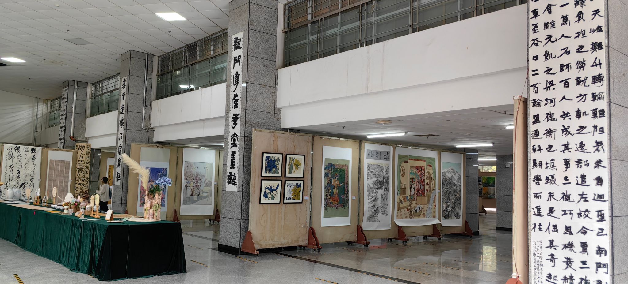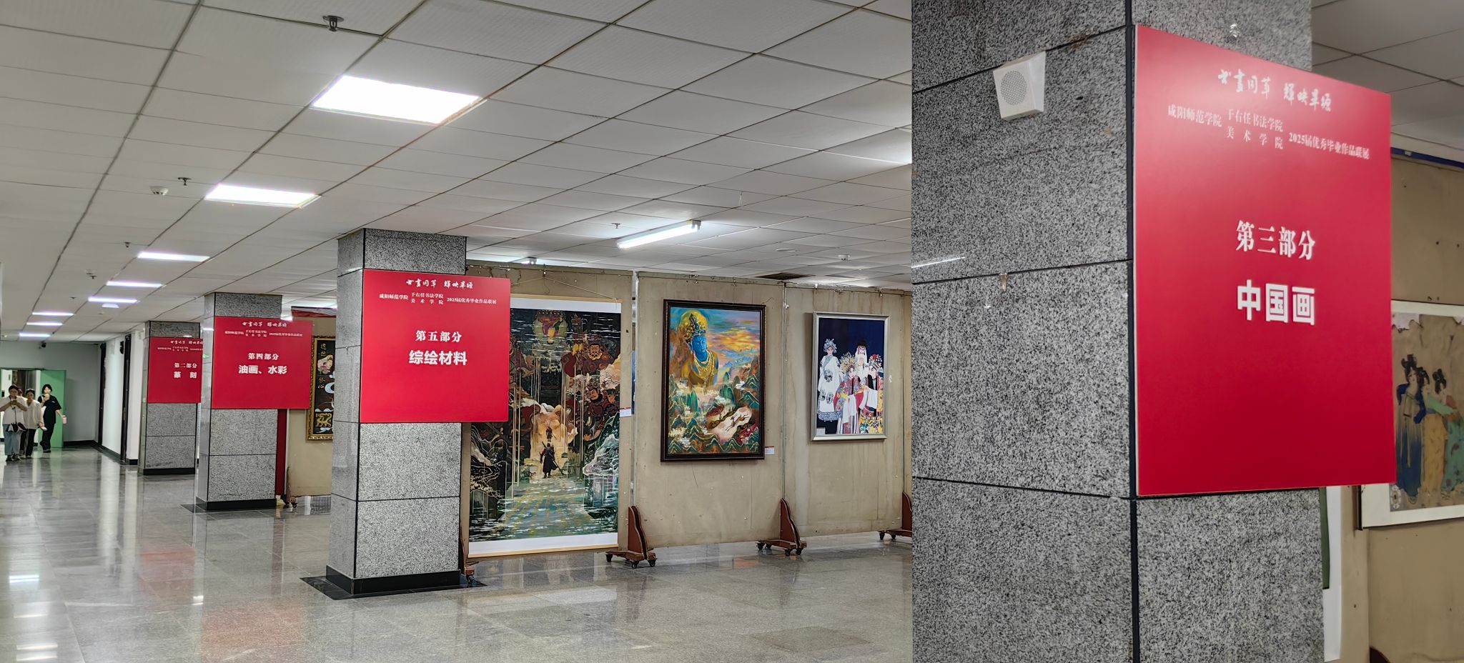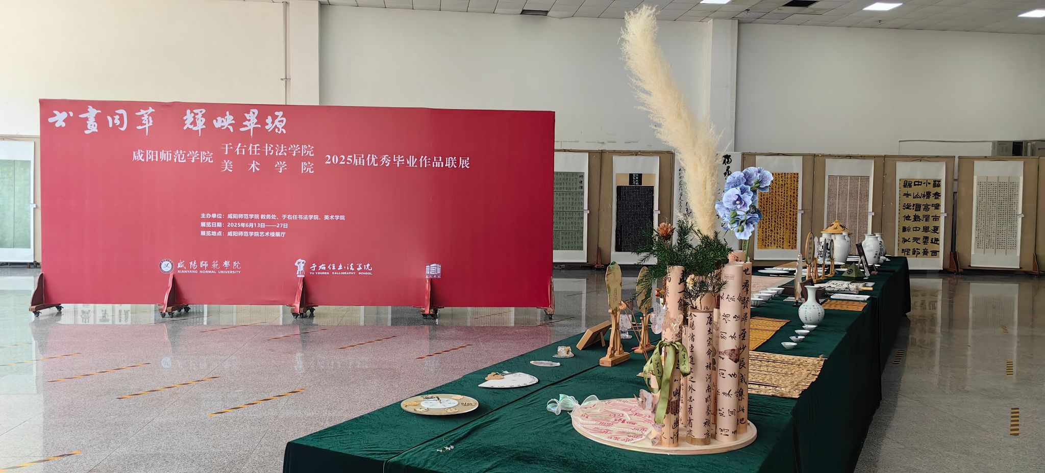 展览“书法”展区,荟萃了60余幅毕业生精心创作的佳作。作品篆、隶、楷、行、草五体兼备,反映出同学们的传统功底与创作追求。在表现形式上,既有承载千年文脉的条幅、对联、扇面等经典形制,也不乏融汇当代审美意趣的创新性文创作品。这些作品是对公司“植根秦汉文化沃土,高扬师范教育旗帜,传承书法经典,彰显文化担当”这一核心教学理念的直观诠释。展览充分体现了公司在育人过程中强调的“传承性”、“师范性”与“地方性”特色,彰显了其致力于培养“品端志远、艺精学高、身正气和、修养全面、形象儒雅”的中华优秀传统文化传承者与弘扬者的坚定目标。