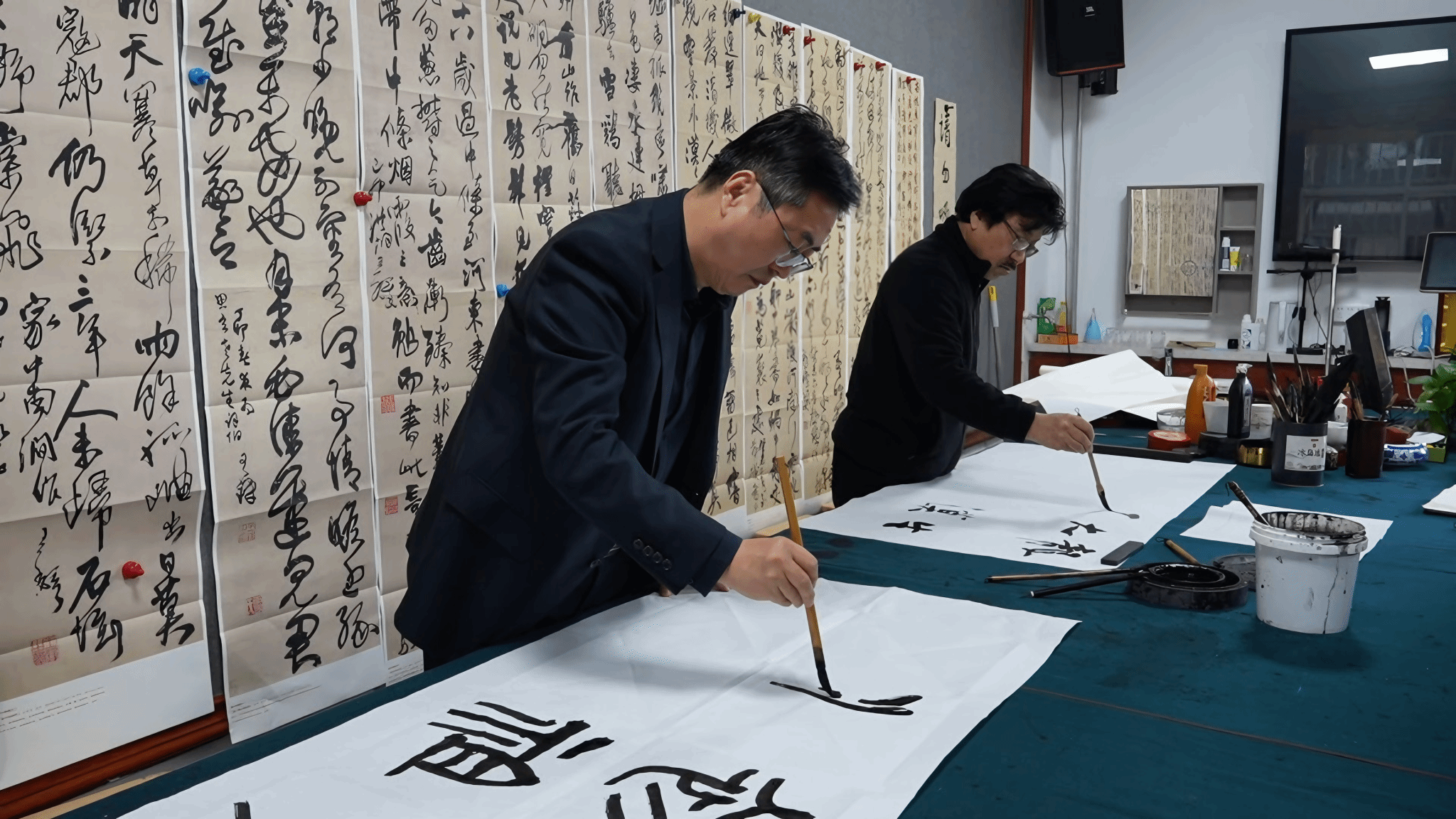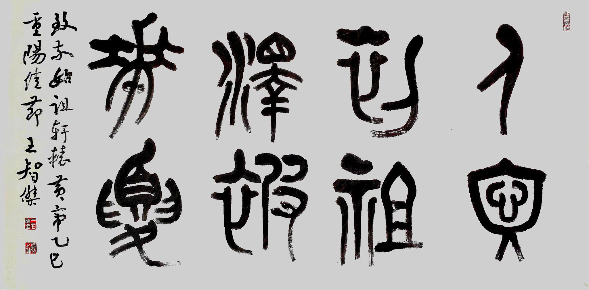 笔会现场,王智杰教授激情满怀,创作了一幅内容为“人文初祖,泽被华夏”的大字篆书作品,作为对重阳节的诗意献礼和对人文初祖轩辕黄帝的崇高致敬,展现了作者的艺术功底和炽热家国情怀。