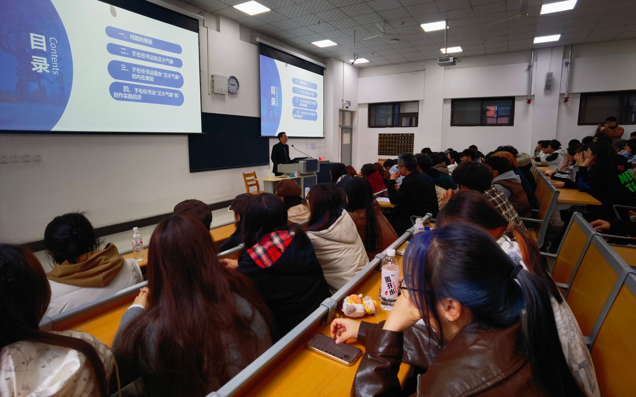 最后,王智杰教授在谈到于右任书法“正大气象”对创作实践的启示时讲到,正大气象应该成为当代书法创作实践和文化传播的主旋律,家国情怀、民族精神、担当意识、人品修为、综合素养是一个书法家提升思想境界和艺术品位最重要的动力源泉和无尽底气。衷肯希望同学们能够以于右任先生为榜样,传承书法经典,走好书法正道,走好书法大道,为弘扬中华优秀传统文化尽到一个书法学专业员工应有的责任。