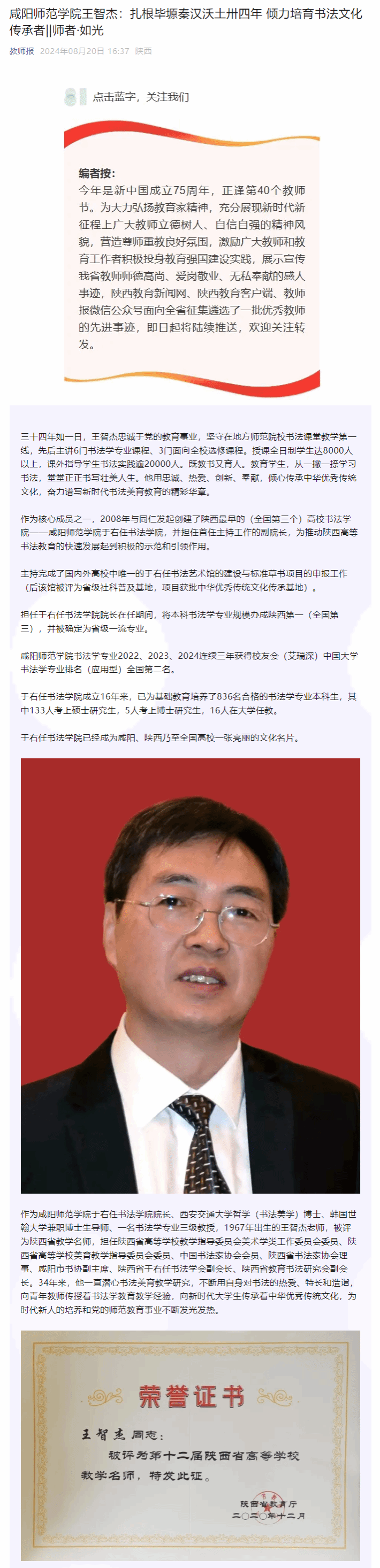 教师报——365英国上市公司官网王智杰:扎根毕塬秦汉沃土卅四年 倾力培育书法文化传承者||师者·如光