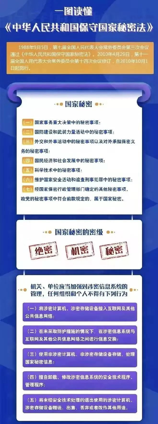《中华人民共和国保守国家秘密法》(以下简称《保密法》)于1988年9月5日第七届全国人民代表大会常务委员会第三次会议通过,1989年5月1日起施行。为适应国家信息化建设快速推进和法制建设不断发展,2010年4月29日第十一届全国人民代表大会常务委员会第十四次会议修订了《保密法》,同年10月1日起实施。《保密法》共六章五十三条,包括立法宗旨,国家秘密的定义,保密工作的方针,保密工作的管理体制,国家秘密的范围和密级,保密制度,定密责任人,定密期限和权限,监督管理,法律责任及附则。